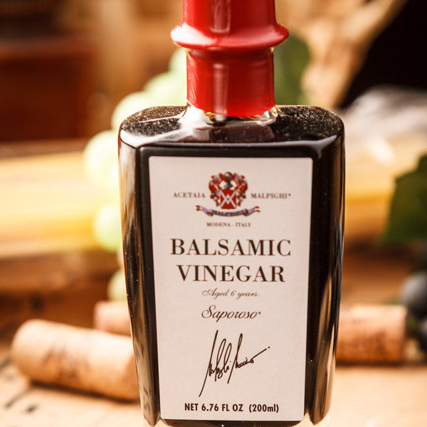 This savory aged balsamic vinegar was originally created for consumers who desired a high-quality balsamic vinegar, specifically of caliber between the regular balsamic vinegar of Modena and the traditional balsamic vinegar of Modena. Our Saporoso is aged for six years in oak barrels, and for six months in steel containers. Lightly tart, this natural product has accents of wild flowers, grass, and cooked mustard.