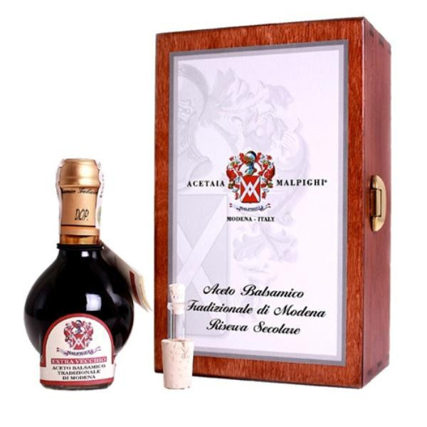Matured for a century, our 100-year aged balsamic vinegar is renowned for its age and rarity and is, without a doubt, the most treasured balsamic inthe world. Its subtle tones of ancient woods enhances a sweetness and velvety texture that is unparalleled. The rarest product in our line offine foods, its flavor is so superb that we recommended you enjoy it onedrop at a time. The most famous method (and also a very popular one) for enjoying the 100-year is as a sweet digestive aid after meals, from the bottle straight to your spoon. 100 ml.